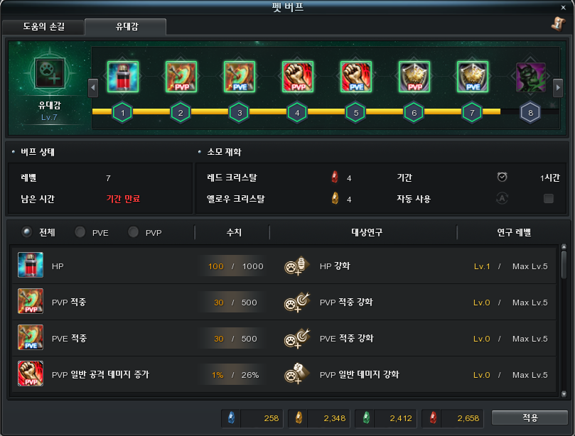 연구소 연구 | 유지력 특성 강화 | 1 | 2,880,000 | 레드 크리스탈 | 5,000 | 공명의 크리스탈 | 4,000 | '유지력' 특성들의 쿨타임 4초 감소 | 도움의 손길 Lv.13 |