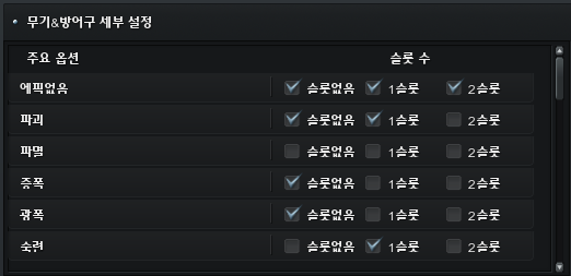- 우측 [무기&방어구 세부 설정] 내 체크 박스를 통해, 원하는 에픽 옵션 및 슬롯 수의 아이템만 추출 가능